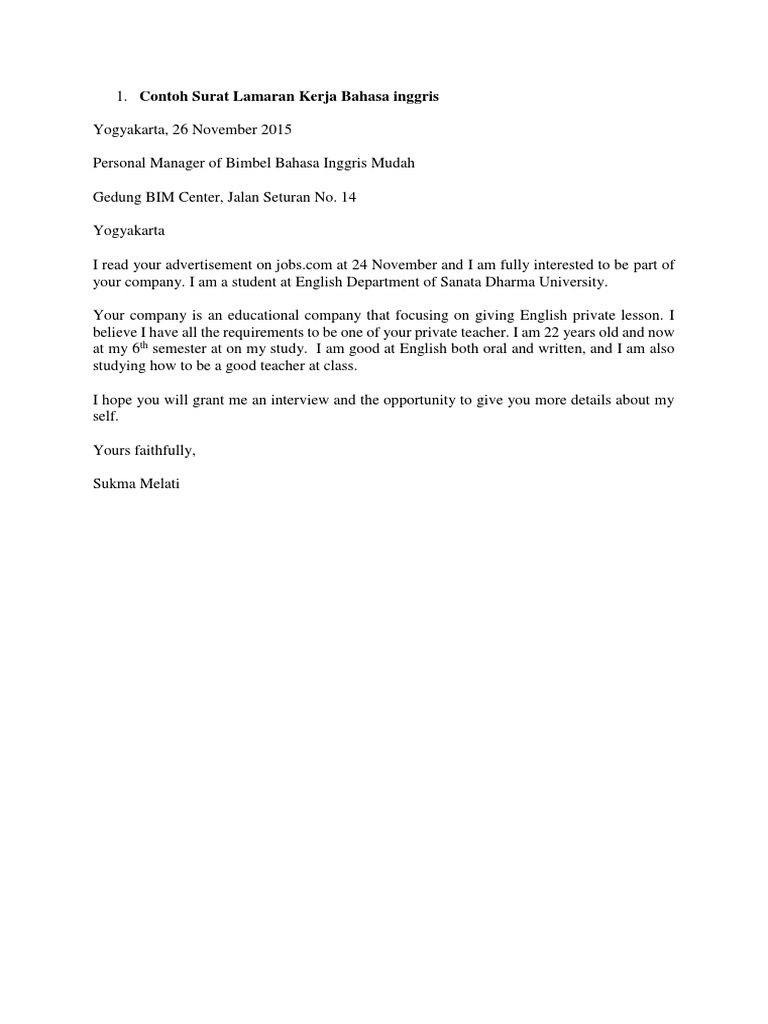 I am undergraduate college student from english department of. But i want to look for the part time job as english teacher for. Contoh surat lamaran kerja bahasa inggris yang profesional sebagai informasi mengenai surat lamaran kerja bahasa inggris yang resmi.