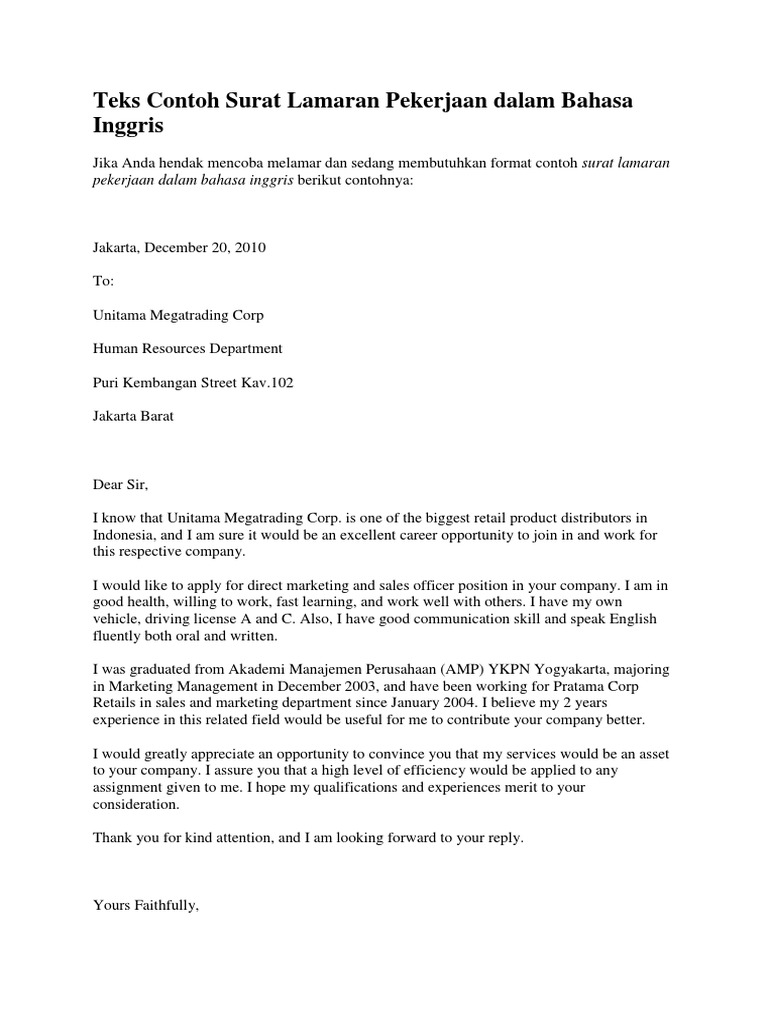 Contoh Surat Lamaran Pekerjaan Dalam Bahasa Inggris Kumpulan