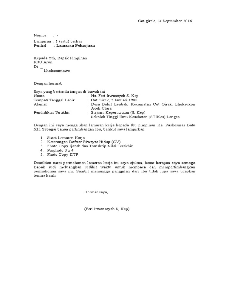 Contoh Sederhana Surat Lamaran Kerja Untuk Puskesmas Tribun