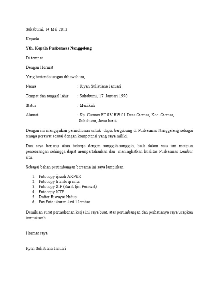 Contoh Surat Lamaran Kerja Di Puskesmas Contoh Resource
