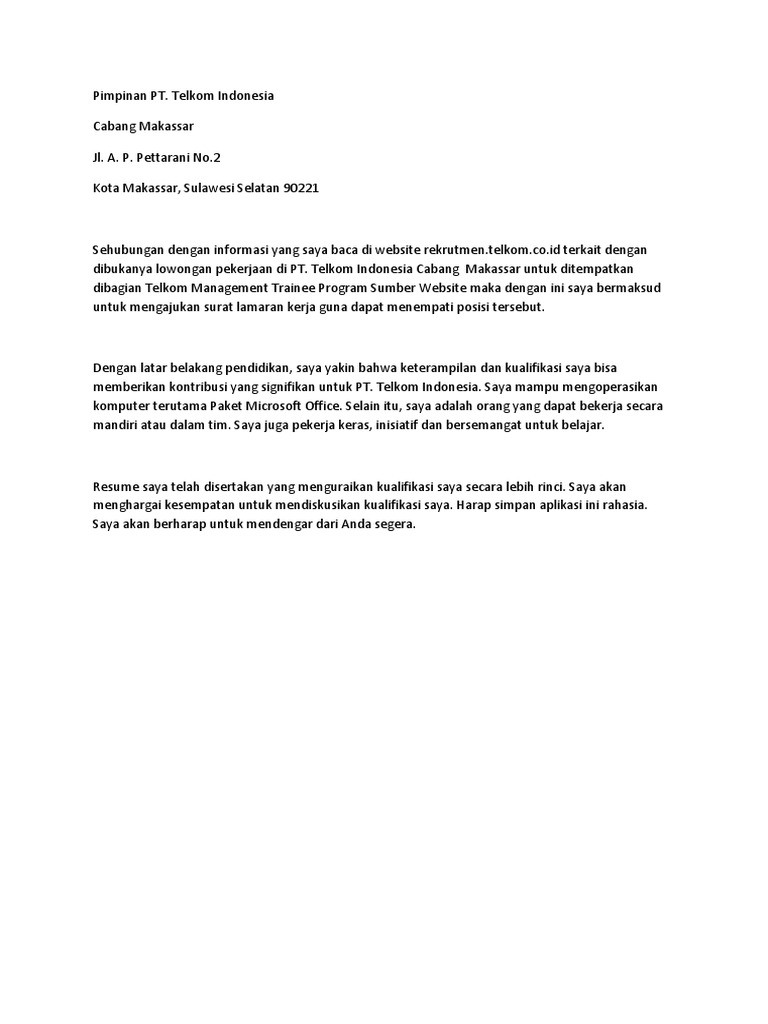 Surat Lamaran Kerja Bumn Lamaran Pekerjaan Telkom Loan