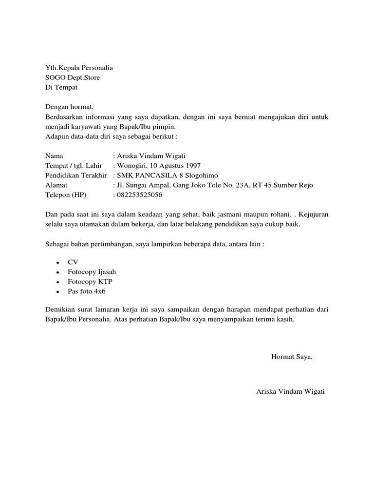 Contoh Surat Lamaran Kerja Spg Matahari 2019