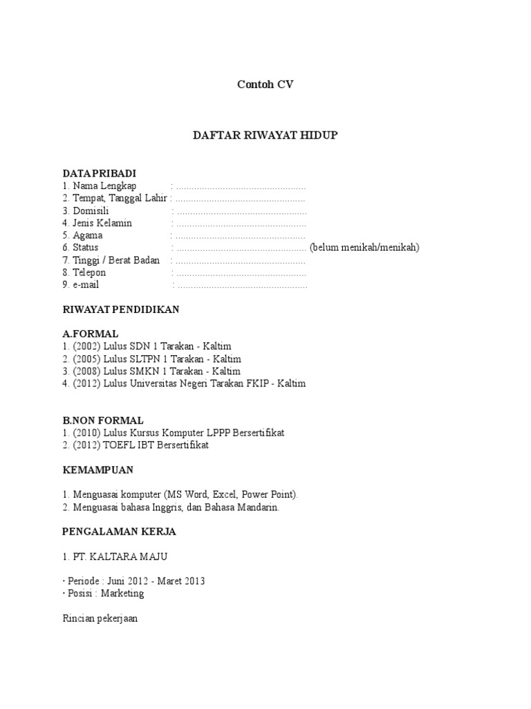 Contoh Cv Daftar Riwayat Hidup Untuk Lamaran Pekerjaan Mikunitensai