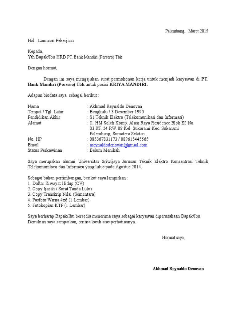 Contoh Surat Lamaran Kerja Bank Mandiri Contoh Surat Lamaran Kerja