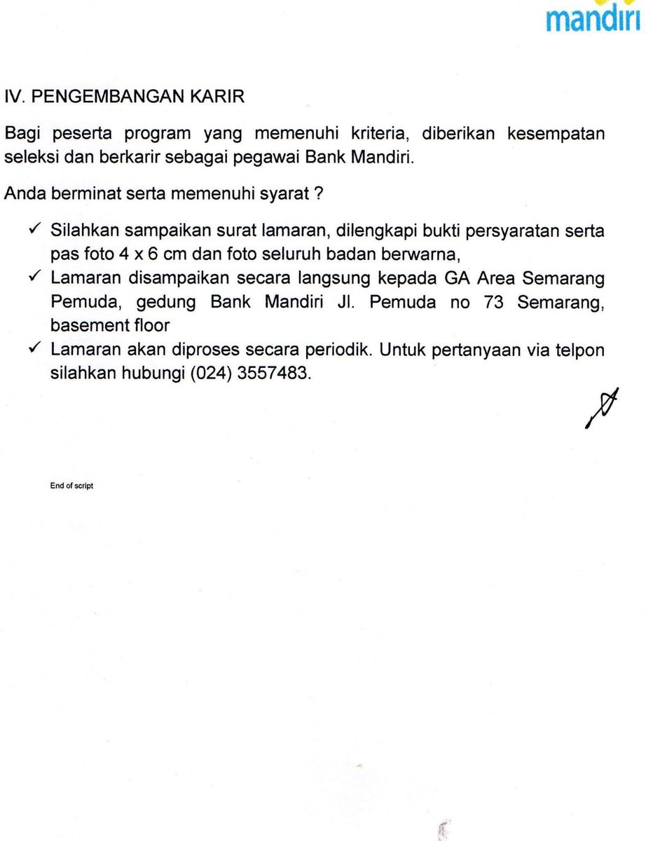 Mohon maaf apabila terdapat kesamaan namatempatinformasi lain karena surat yang dibuat hanya bertujuan sebagai percontohan tanpa ada maksud apapun. Kriya mandiri itu program magang di bank mandiri selama 1 tahun lebih gampangnya tuh gini klo lo diterima lo kerja dikontrak 1 tahun klo selama 1 tahun kinerja lo bagus diperpanjang 1 tahun lagi sampai 3 kali perpanjang. Buat teman teman yang ingin membuat lamaran pekerjaan khususnya di bank mandiri.