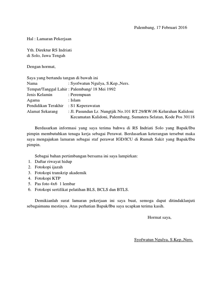 Contoh Surat Lamaran Kerja Perawat Di Rumah Sakit