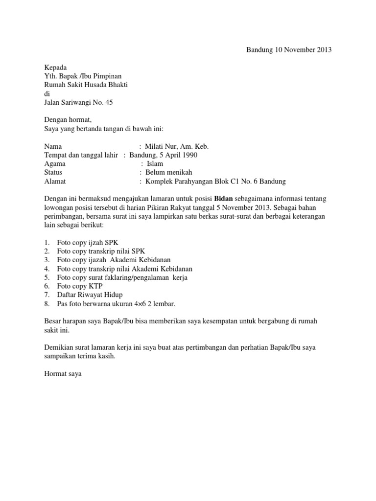 Contoh Surat Lamaran Kerja Bidan Rumah Sakit Swasta Contoh Surat