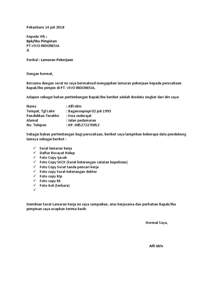 Surat Lamaran Kerja Docx Hal Lamaran Pekerjaan Pekanbaru 05 April