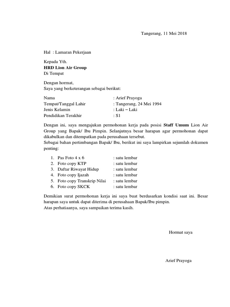 Cover Letter Pt Lion Air Contoh Agus Pdf