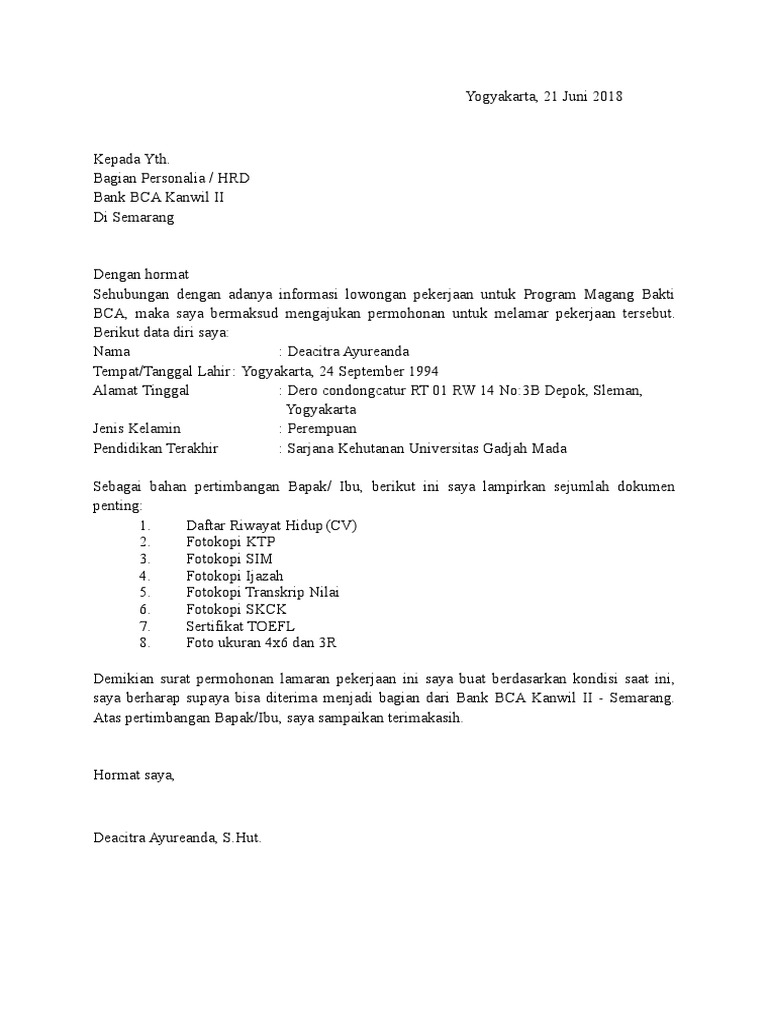 Contoh Surat Lamaran Kerja Di Bank Magang Bhakti Bca