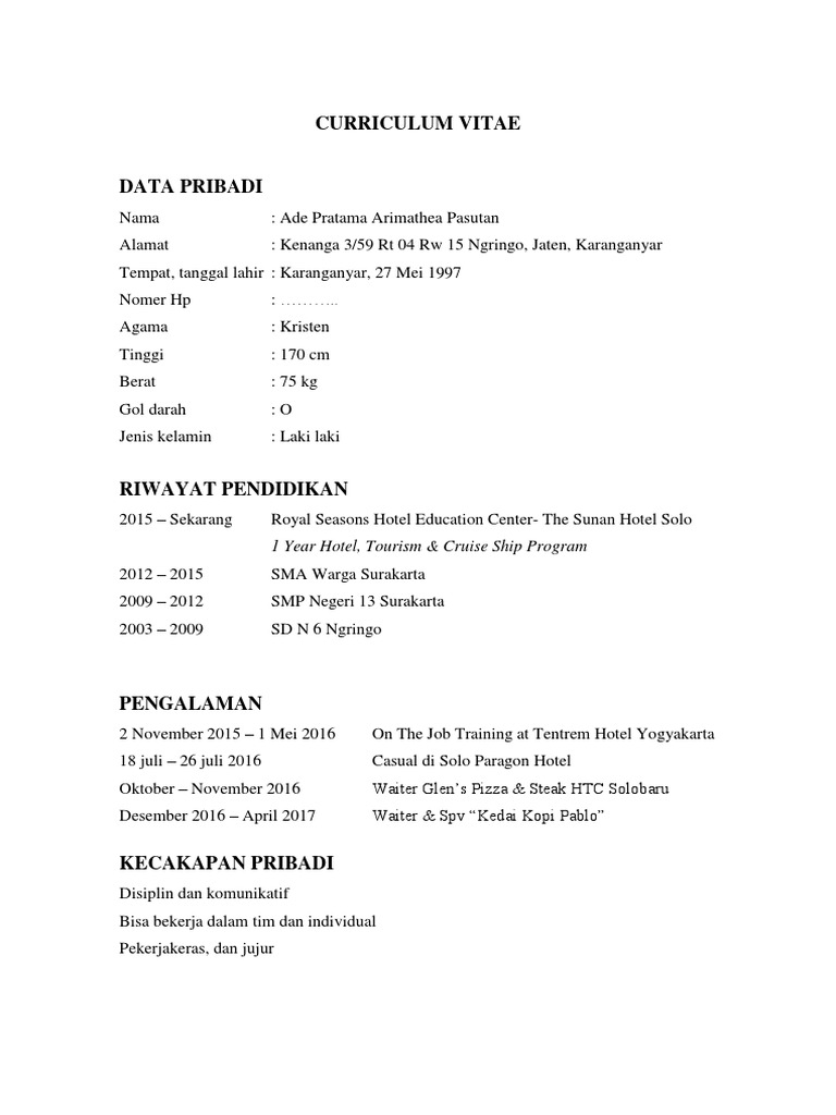 Contoh Surat Lamaran Kerja Waiter Fb Service Hotel Dan Restoran