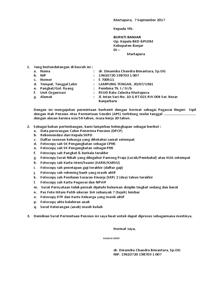 Dengan catatan mengkilap di usia belia jack memiliki potensi untuk tumbuh menjadi pemain hebat. Home contoh surat contoh surat permohonan pensiun pns tahun 2018 surat permohonan permintaan pensiun dibuat oleh guru pns karena sudah habis masa baktinya tarpaut batas usia telah penuh. Saya ada yg akan mengajukan pensiun dini sudahmemenuhi syarat yaitu umur 50 tahun dan 20 tqhun lebih masa kerjamohon contoh format surat pernyataan pensiun dini dan formulir permohonan pensiun dinilalu alasan yang tepat pengajuan pensiun dini kira kira apa ya.